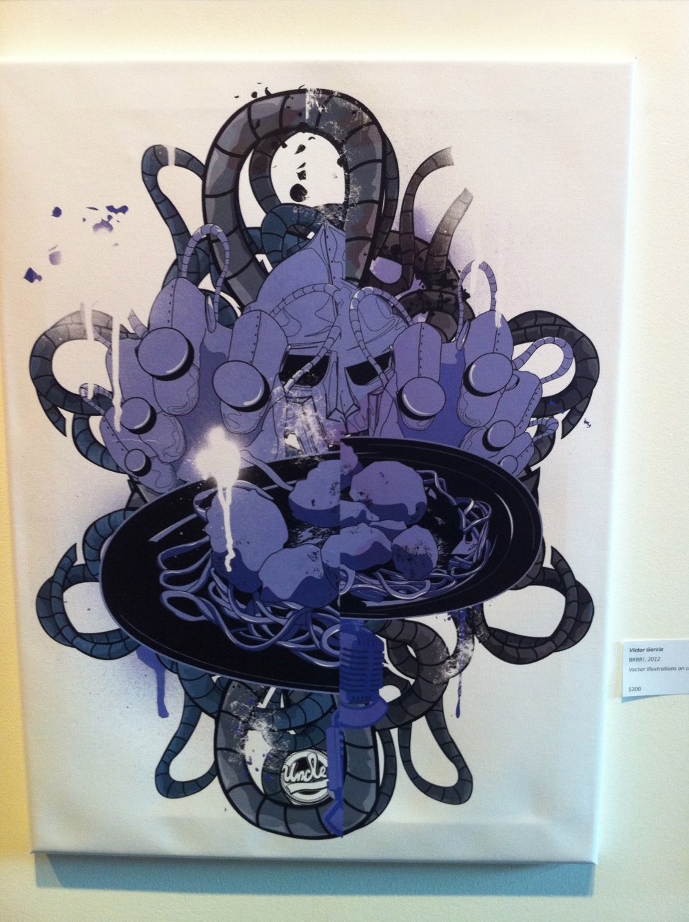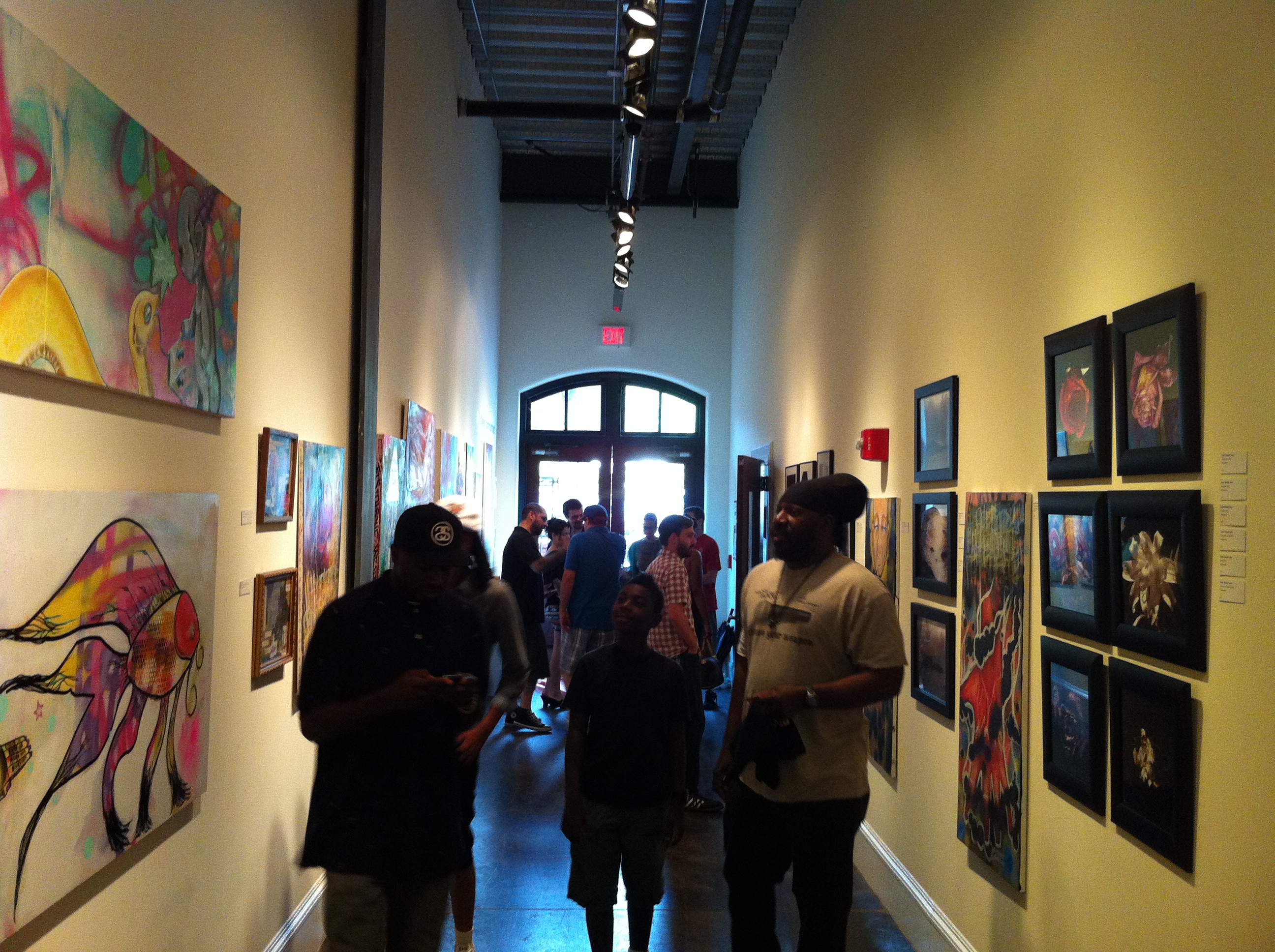 The exhibit includes still photography taken by a keen eye, which pulls you into each captured moment. Moving along the walls of the unique hall gallery you come across colorful works of mixed media. There are scenes of DJs spinning and moments of adult leisure depicted with oil, marker, as well as spray can. This is definitely not your momma’s art exhibit, well not unless your momma is Tahirah Spann who herself is an artist as well as helping ensure the business side of things are in order. Staying on task she quickly advised me “that all artwork is priced to sell, so if you see something you really like it can be yours.”