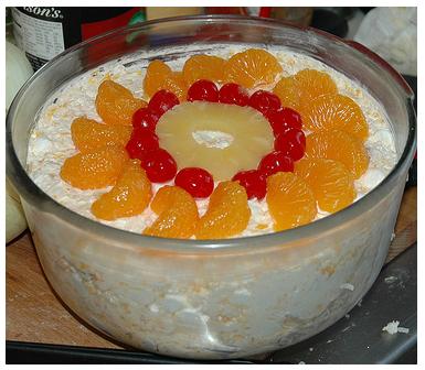 I was raised as an only child in a two parent household. Most holidays were spent with aunts and uncles at various family members homes; however my parents regularly cooked a full holiday meal. Usually my dad would roast cornish hens instead of a turkey on Thanksgiving; there is only so much turkey a three person family can eat. The sides would vary sometimes the vegetable would be a type of greens either collards or a turnip and mustard mix. However there was staple treat that my dad usually made, ambrosia salad was a normal part of Thanksgiving and Christmas holidays.